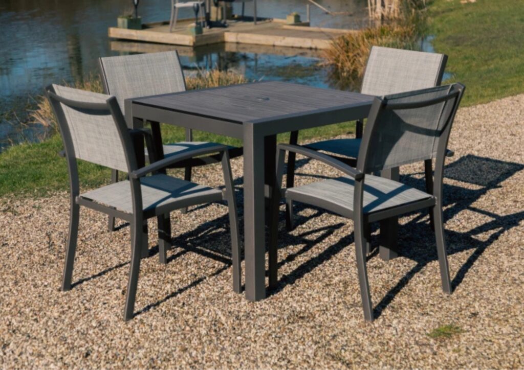 - The adjustable-height square table, featuring a durable aluminium top, adds versatility to your outdoor setup, transitioning effortlessly from casual coffee mornings to elegant evening dinners.